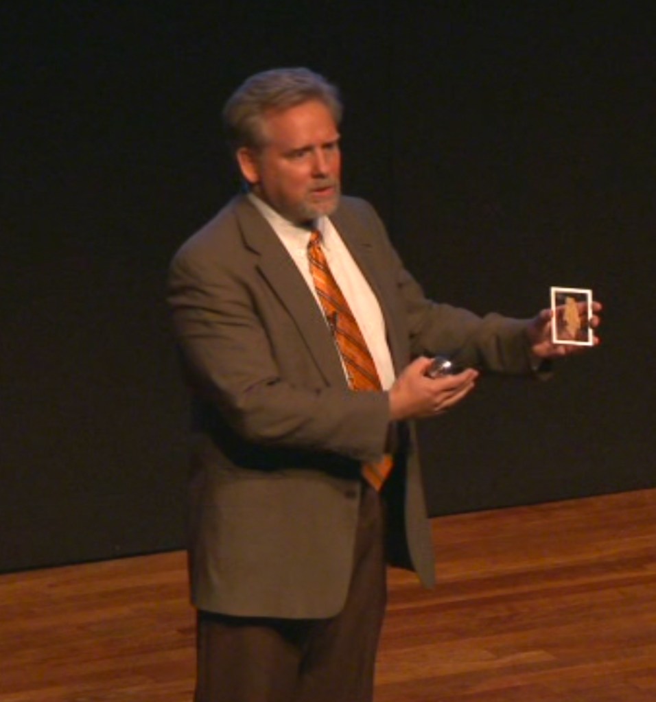Jerry Pattengale with a stolen Oxyrhynchus papyrus during a lecture in the “Passages” series in 2011